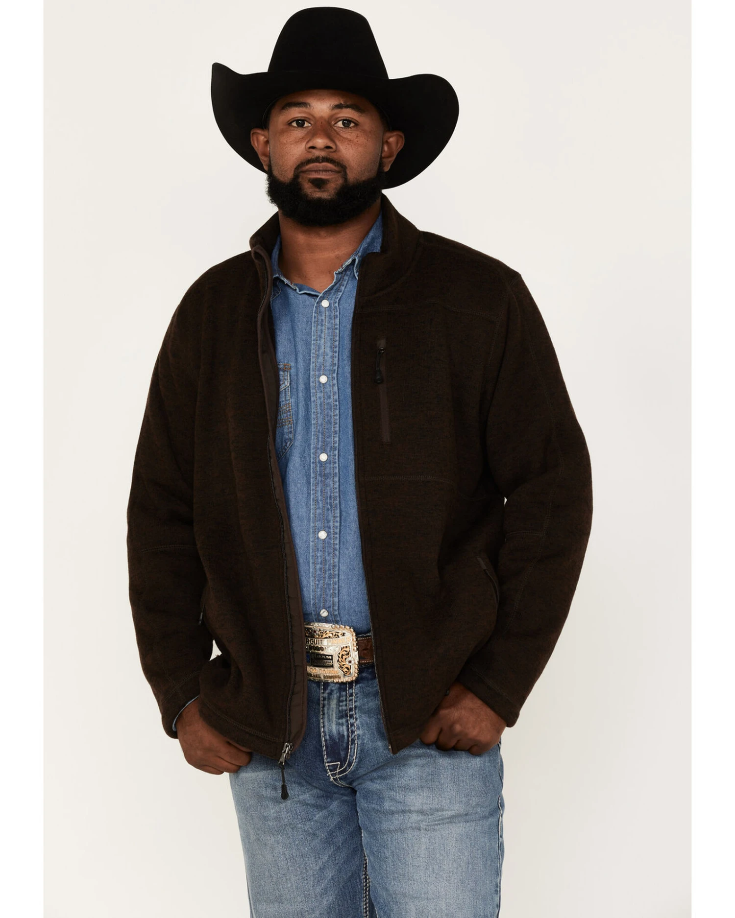 - Zippered left chest pocket and hand pockets